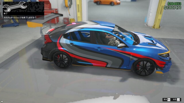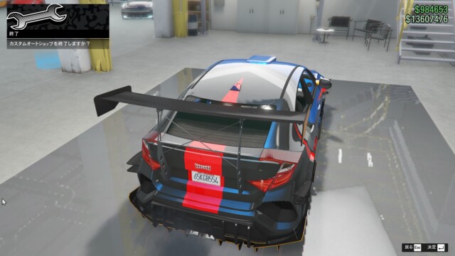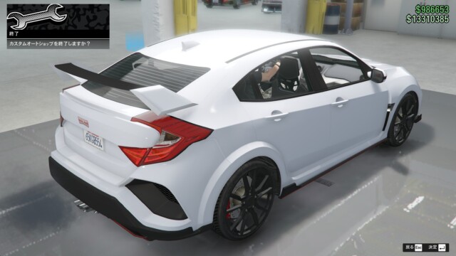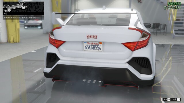 まずは、めちゃくちゃいかつくしてみました。デカいディフューザー、デカいスポイラーにカナードも付けて、ペイントも派手な感じに。もともと大きめの車体なので、デカスポイラーでも不自然さは感じませんね。